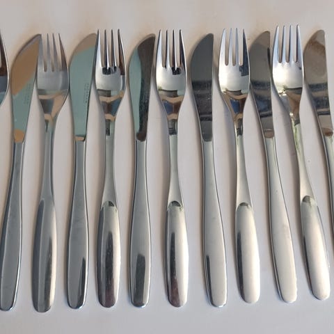 Hackman aterinsetti, joka sisältää lusikat, haarukat, veitset ja kahvilusikat 6 kpl kutakin sekä yksi iso tarjoilulusikka. Käytössä olleet.