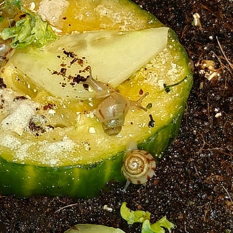 Lissachatina immaculata var immaculata kotiloita, helmikuussa 2025 kuoriutuneita. Kokoa nyt n. 8-9cm.