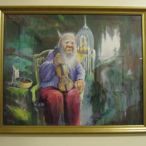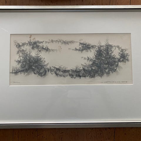 Kuvissa oleva Sussi Anna Åbergin guassityö. Taulun ulkomitat 75 x 55 cm. Nouto Kuopiosta keskustasta.