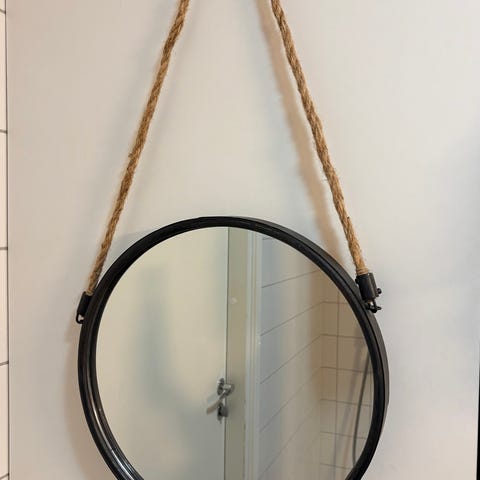 Cello merkkinen pyöreä peili mustalla sisustusremmillä. Peilissä ei näkyvää reunusta. Katso kuvista kunto.