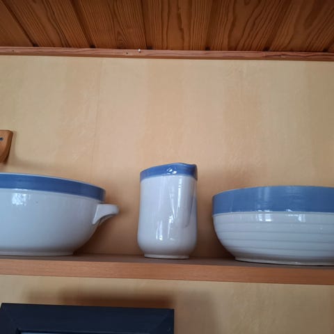 Molemmissa pieniä käytön jälkiä lähinnä reunassa. Ei krakeloitumaa eikä kolhuja/ halkeamia.