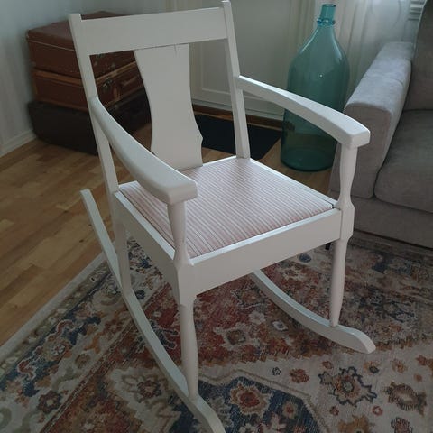 Puinen keinutuoli. Koira hiukan purrut jalasten etukulmia.