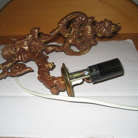 Vanha messinkinen seinälampetti. Korkeus 24cm, syvyys 16cm, leveys 6cm. Toiminta testattu, palaa. Muovinen kynttilävarsikin löytyy. Nouto Tampereen Tammelasta.
