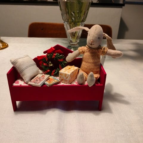 Tämän Maileg hiiren pituus on 13 cm. Penkkisänky on vaneria ja sen on vuodevaatteineen valmistanut Estoniateatterin lavastaja Laura Mailegin Pählapuu. Jouluaiheinen kirja ja joululahja ovat osatotavaraa. Mittakaava on 1:12, eli nukkekotimittakaava.
