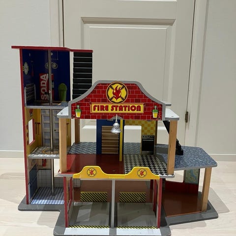 Myydään puinen Pintoy paloasema sisustuksineen, paloauto ja kolme palomiestä.