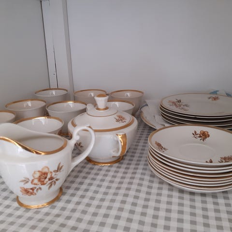 Kuvien vanha astiasto. 8 kuppia, 11 tassia, 12 kakkulautasta, kermakko ja sokerikko. Yhteishintaan 30€. Nouto/käteinen