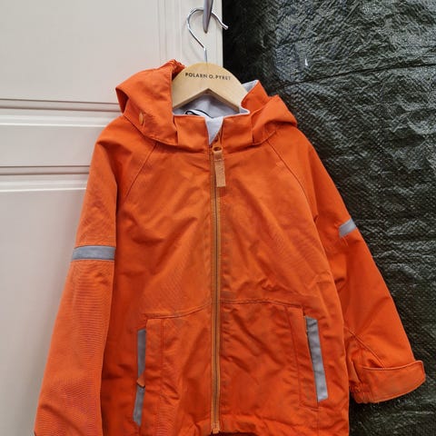 Popin kuoritakki koossa 92. Kunto on hyvä käytetty, mutta muutama moite löytyy: kauluksessa reikä päällikankaassa, nappien ulkopinnassa kulumaa, haaleaa tummentumaa kankaassa ja vetoketju hieman jäykkä mutta toimii.