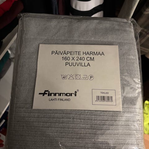 Finlayson päiväpeitto harmaassa värissä. Keskellä vaalea tahra, joka näkyy kuvassa.