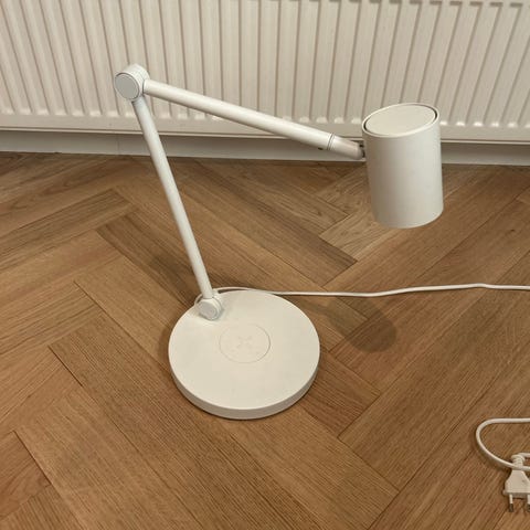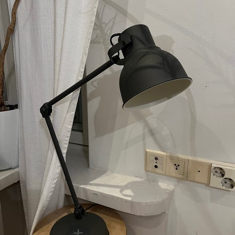 Musta kohdevalaisin / työvalaisin / yöpöytävalaisin. Lamppu mukana. Langaton laturi ja USB-C paikka toiselle laturille. Ei käytön jälkiä.