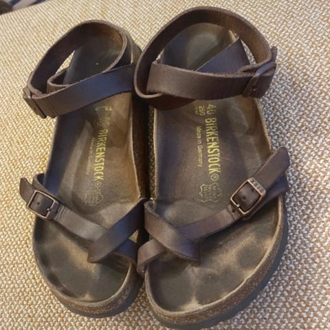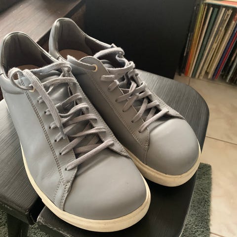 Hieman levennetyt Birkenstockin korkeavartiset tennarit, aitoa nahkaa. Olleet jalassa yhteensä noin 3 tuntia. Pohjallinen ei vielä muotoutunut. Regular-leveys ja sisäpohjan pituus 26 cm.