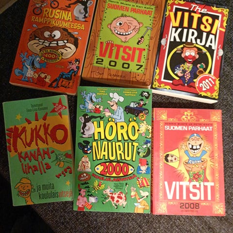 Tästä neljän pokkarin paketti vaikka joululahjaksi tai lomalukemiseksi mökille. Vitsikirjat lukemattomia, visailua luettu, mutta kunto uudenveroinen.