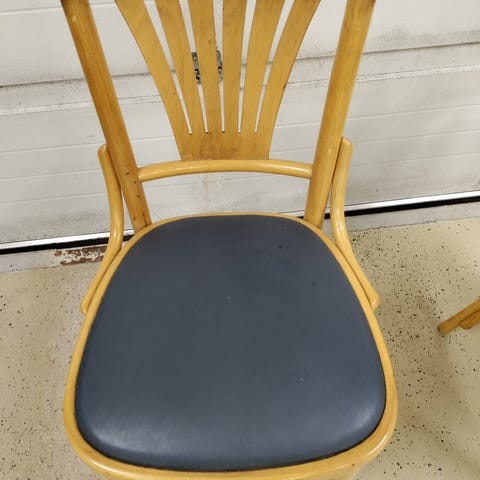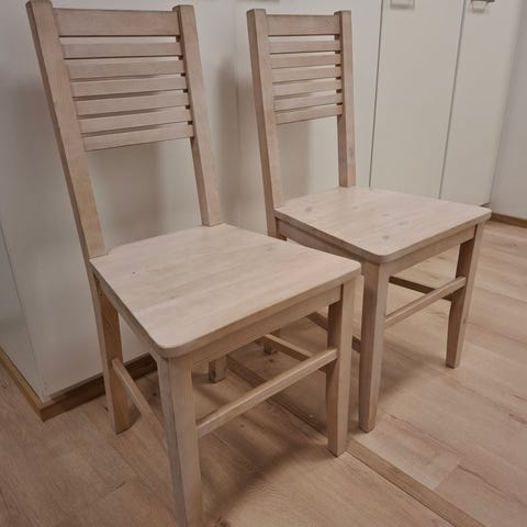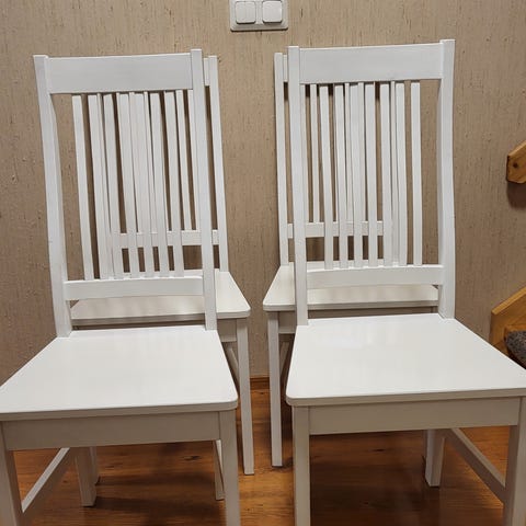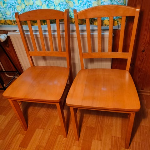 Lapsiperheen elämää nähneet puiset tuolit. Yhteensä 8 kappaletta. Hinta yksittäin 10 e. Kaikki kerralla 50 e.