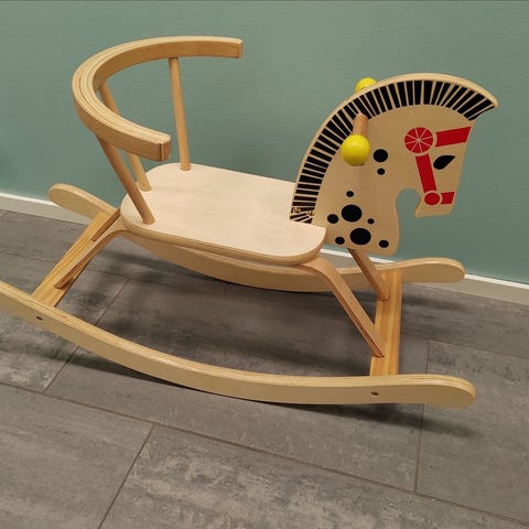 Hiukan elämää jo nähnyt, mutta silti hyväkuntoinen täyttä puuta oleva keinuhevonen.