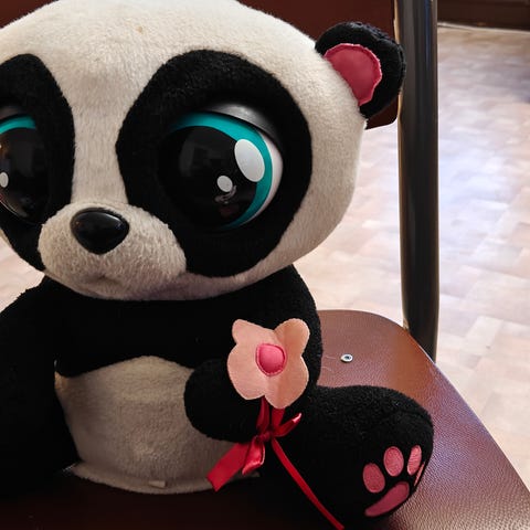 kuvassa oleva Panda vauva joka tassusta painamalla juttelee ja ilmoittaa haluavansa haleja, istumakorkeus n.25 cm.
