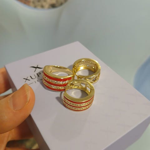 Xuping korvakorut, joissa on emali ja zirkoniakivikoristelu. Laadukas materiaali, ei tummu. On myös samantyypinen sormus.
