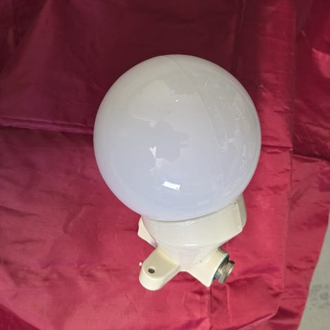 Messinkinen, toimiva pallovalaisin- kattokiinnitys. Kipu valkoista lasia, halkaisija noin 30 cm.