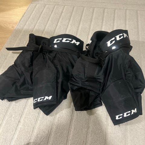 CCM JR M, jääkiekkohousut. Väri tummansininen. Housuissa näkyy käytön jälkiä ja kulumaa erityisesti lahkeissa. Muuten hyvä käytetty kunto.