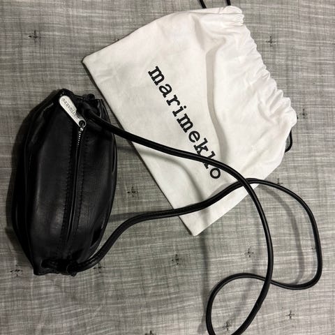 ”Karkkipaperista inspiraationsa saanut, kaksivärinen Mini Karla -olkalaukku on valmistettu nahasta, jossa on metallinhohtoinen pinnoite. Pienen pienessä laukussa on kapea olkahihna ja vetoketjusuljenta. Sisävuori on valmistettu kierrätetystä polyesterista. Metallinhohtoisissa nahkatuotteissa näkyy ajan kuluessa luonnollista patinaa.”