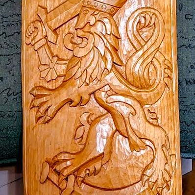 Suomi-aiheinen kaiverrus ja koristeellinen muotoilu. Esineessä on polttokuvioita ja se on valmistettu puusta. Sopii erinomaisesti puunkantohommiin, sisustukseen tai ihan vaan keräilyesineeksi.