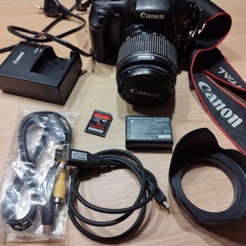 Kuvan mukainen toimiva Canon -kamera. Mukaan tulee akku, laturi ja muut kuvan härpäkkeet. Kaupan päälle halutessa myös tuo jalka. Kappale joka yhdistää kameran ja jalan on kadonnut jonnekkin mutta ehkä sellaisia löytyy vielä jostain erikseen?