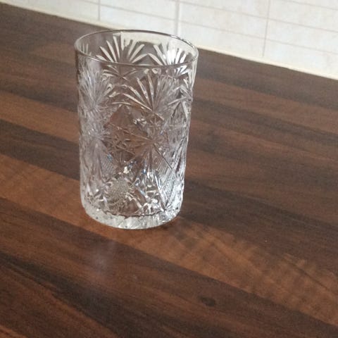 Ohut, virheetön punainen kristallilasi. Korkeus n 14 cm, ylähalkasija n 7 cm. Nouto tai postitus.