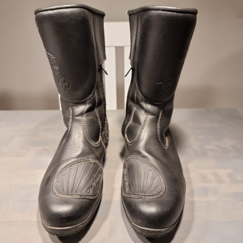 Core-tex mustat saappaat, joissa on vetoketju ja tukeva pohja. Sopivat ulkokäyttöön ja tarjoavat suojaa ja mukavuutta jaloille.
