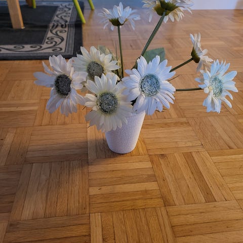 Kuvanmukainen siisti ja hyvä muovikukka.Vaihdossa rasvaton maito lapsille.Kerro heti viestittäessä milloin nouto käy!