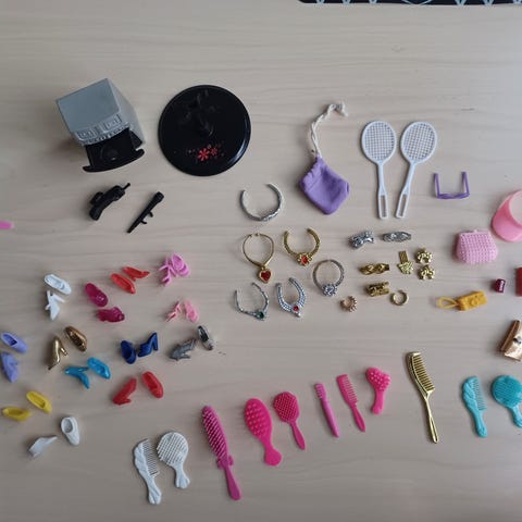 Myydään 2 kpl barbie nukelle sopivia vauvoja (en tiedä ovatko barbie merkkiä, tuskin). Mukaan kuvan tavarat, metalli laukku avattavissa. Ostoskärryt rikkinäiset, työntöaisa taipunut ja sivu kasattu nippusiteillä. Toimiva tällä lailla kuitenkin. Vauvojen vaatteet likaiset, kaipaisivat pesua.