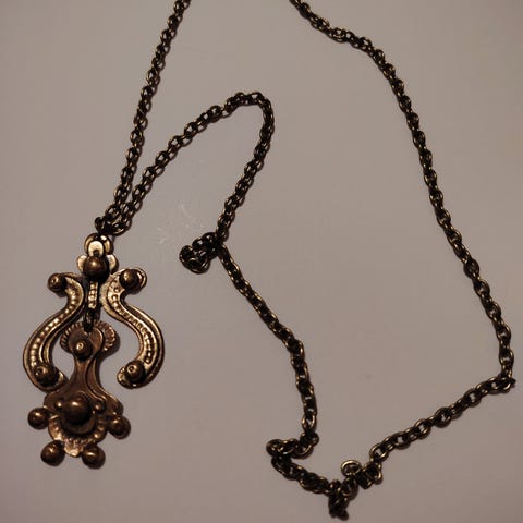 Seppo Tammisen suunnittelema, hyväkuntoinen pronssinen kaulakoru. Riipuksen mitat ovat 4,5cm x 4cm. Ketjun kiinnityskohta on viallinen ja ketjun saa halutessaan mukaan kauppaan.