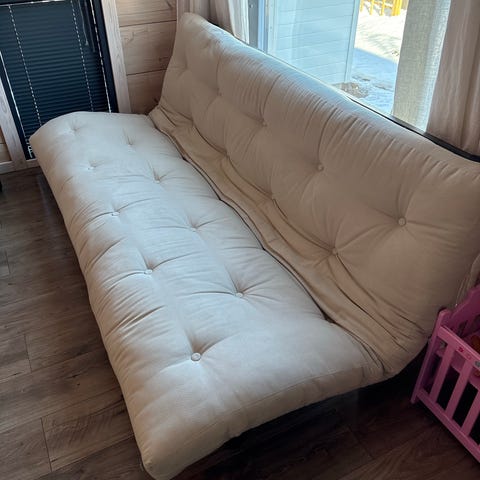 Kaupan päälle patja ja tyynyt 2 kpl sekä kuvassa näkyvä pellavakangas. Patjassa leikkiä (yritetty pestä vesipesurilla). Patjaa tuuletettu säännöllisesti ja on täysin käyttökelpoinen. Tuotteeseen on ostettavissa uusia patjoja mm. Vepsäläiseltä.