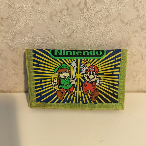 Super Mario Bros. TM Lompakko, siinä käytönjälkeä on muidenkin edestä, mutta suurimmaksi osaksi ehjä ja ihan käyttökelpoinen vielä, takaosan taitoksesta hiukan halkeillut pinta, muuten lähinnä kulumaa.