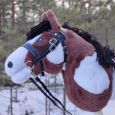 Poni on tehty velboasta, päässä valkea katkonainen piirto. Ponilla upotetut sieraimet, keppiä ei tule mukaan ja voin tehdä varusteita mukaan lisähinnasta.