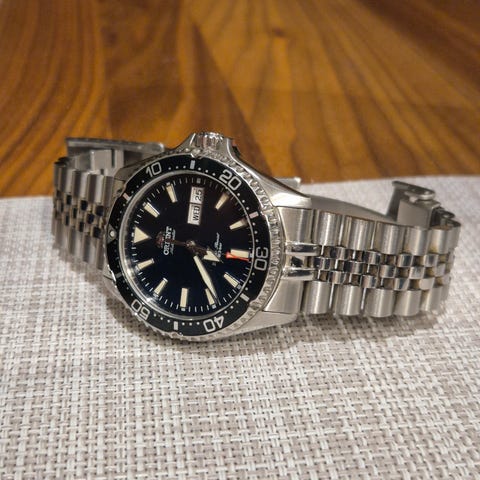 Myynnissä olisi erittäin hyväkuntoinen Orient Kamasu. Kello toimii juuri niin kuin pitää, ja normaaleja käytönjälkiä lukuunottamatta käytännössä virheetön. Lisätietoja saa kysymällä.