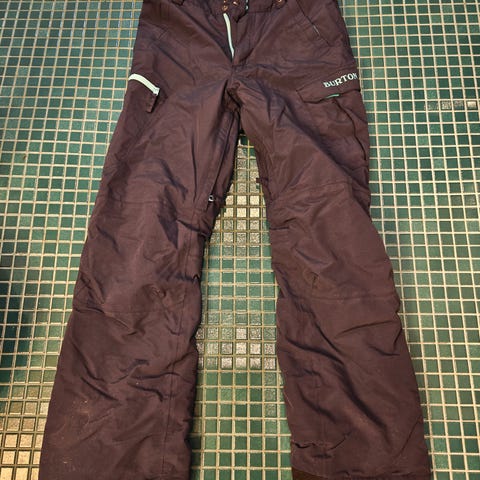 Kauniin siniset Burtonin lasketteluhousut, ilmoitettu koko 150-163cm. Ollut käytössä 152-158-koossa. Sylissä nyppyä, mihin takin tarra osunut.