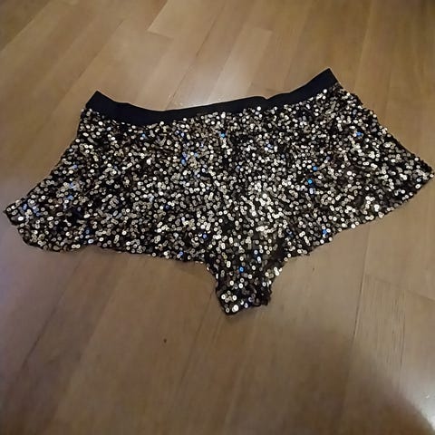 Myydän kerran käytetyt mustat juhlahousut, paljetti. Levenevät lahkeet.