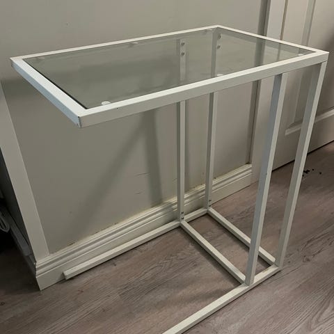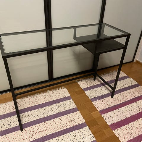 Pöytä on pääosin ehjä, eikä lasi ole halkeillut. Lasipinnassa on käytössä tullut naarmuja. Mustissa metalliosissa on myös käytön jälkiä.