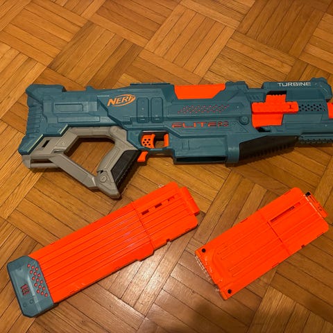 Moottoroitu leikkipyssy, jossa on kaksi piippua, jotka liikkuvat edestakaisin ampuessasi. Kaksinkertainen lipaskapasiteetti – lataa ja ammu kaksi lipasta peräkkäin.