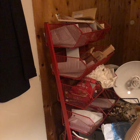 Myynnissä Tokmannista ostettu, lattialle sijoitettava teräsrunkoinen Brücke-säilytyslokerikko. 47 osaa: 32 pientä lokeroa (165 x 105 x 75 mm) ja 15 isoa lokeroa (235 x 150 x 125 mm). Lokerot ovat kestävää PP-muovia. Väri harmaa. Mitat: K115 x L90 x S28 cm.