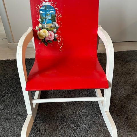 Punainen lasten keinutuoli 1970-luvulta.