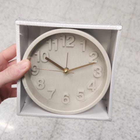 Tuote: Moderni, pyöreä pöytäkello, jonka halkaisija on 13,5 cm.