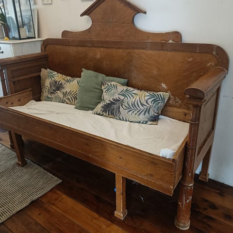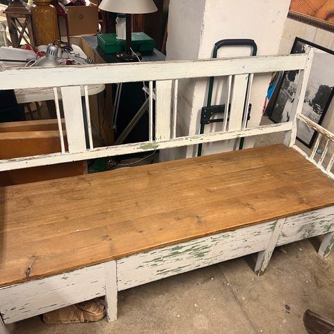 Sohvassa on näkyviä kulumia ja maalipinnan lohkeamia, erityisesti kulmissa ja jaloissa. Puupinta on kulunut, mutta se lisää sohvan autenttista ilmettä. Yleiskunto on tyydyttävä, mutta vaatii huoltoa tai kunnostusta.