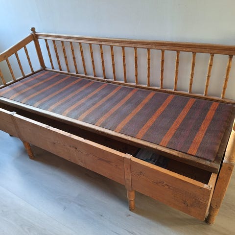Talonpoikaistyyliä edustava puusohva, jossa on sininen ja keltainen väritys. Selkänojan koristeellinen aurinkokuvio tuo esiin käsityön taidon ja perinteisen muotoilun. Sohvassa ulosvedettävä osa, joka mahdollistaa sohvan käyttämisen vieraille sänkynä. Istuintaso / pehmuste puuttuu. Sisämitta: 161cm x 55cm. Avattuna noin 100cm sisäleveys. Istuinkorkeus 48cm