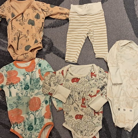 Äitiyspakkauksesta vaatteita settinä, kaikki saman vuoden pakkauksesta. Kokoa 62 68, 68/74. Vähän käytettyjä, kunto kuin uusi kaikissa. Väritys valkoinen ja limen vihreä. Ihana pupu kuutti aiheena.