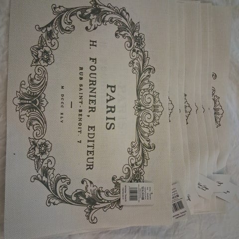 Tabletti-/lasinalussetti (ehkä kiinalainen?). Sisältää 6 kpl tabletteja (30×45) ja 6 kpl lasinalusta. Käyttämättömät