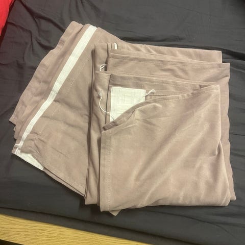 Vaaleanharmaat, eläväpintaiset verhot 100% polyesteriä.