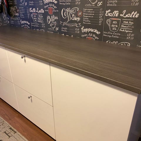 Uusi keittiötaso 185x90,5x3cm. Tehtaalla reunanauhoitettu kolmelta sivulta. Pieni osumajälki vasemmassa, näkyy kuvassa.