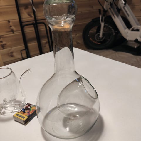 Karahvin korkeus 19,5cm ilman korkkia. Korkin kanssa noin 26 cm. Lasien korkeus 11,5cm.