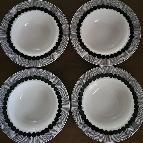 Myydään käytettyjä lautasia 6kpl. Yhdessä haljennut reuna, joka liimattu. Muissa vain naarmuja, jotka näkyvät tiettyä valoa vasten.