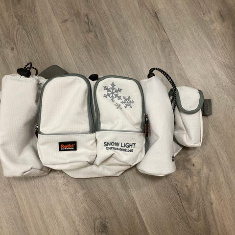 Myydään kerran käytetty Oasics vyötärölaukku ja juomapullo. Pitkät, säädettävät kiinnitysremmit
