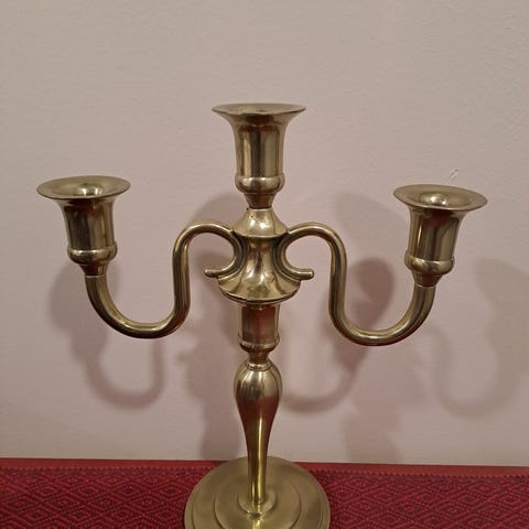 Messinkinen 3-haarainen kynttilänjalka, jossa koristeellinen muotoilu ja painava jalusta. Sopii kolmen kynttilän asettamiseen.